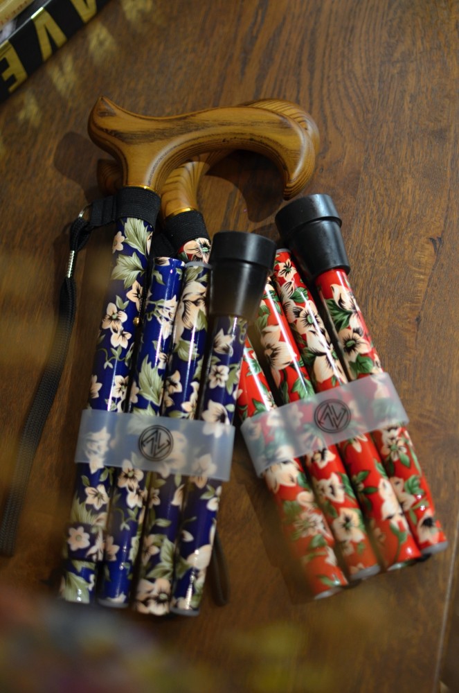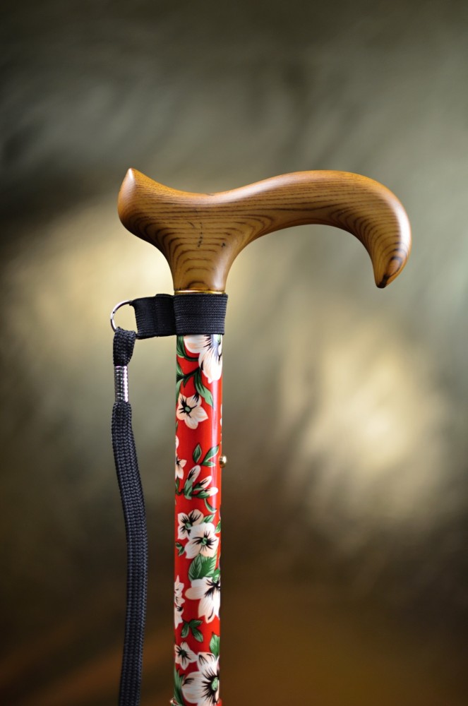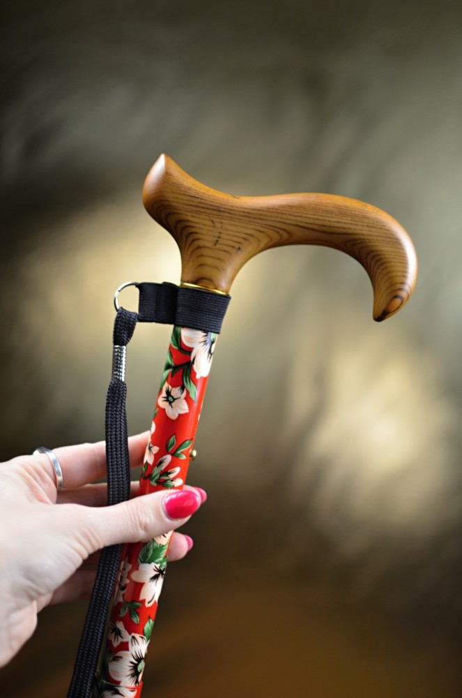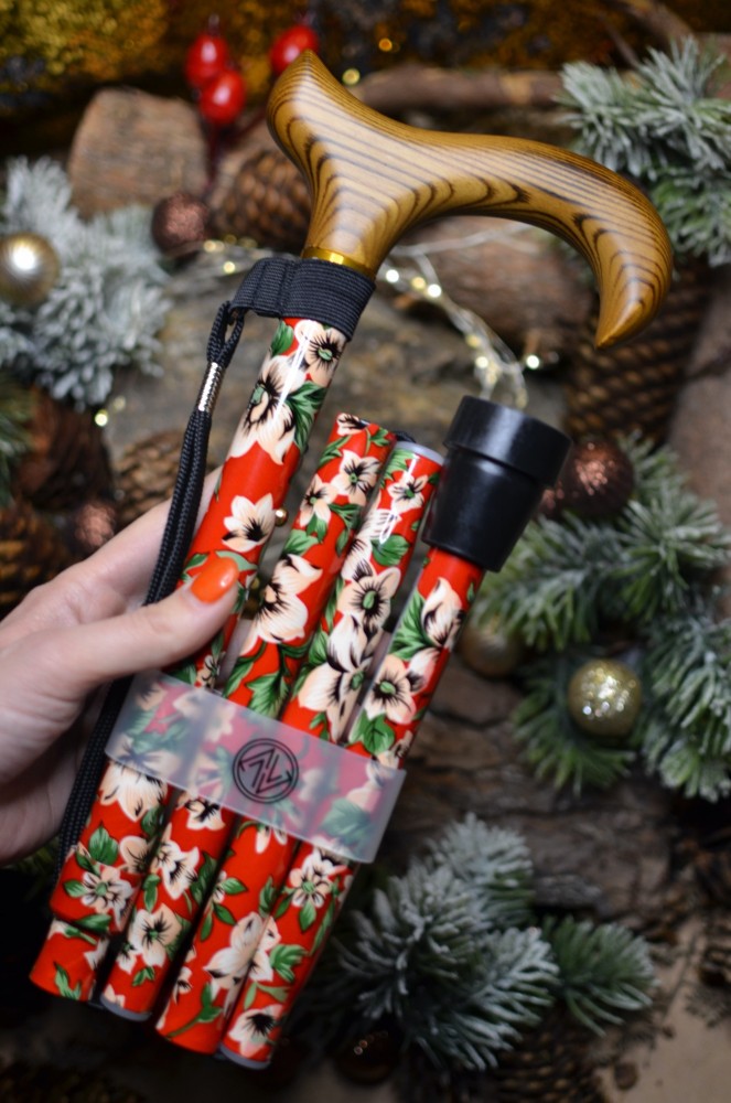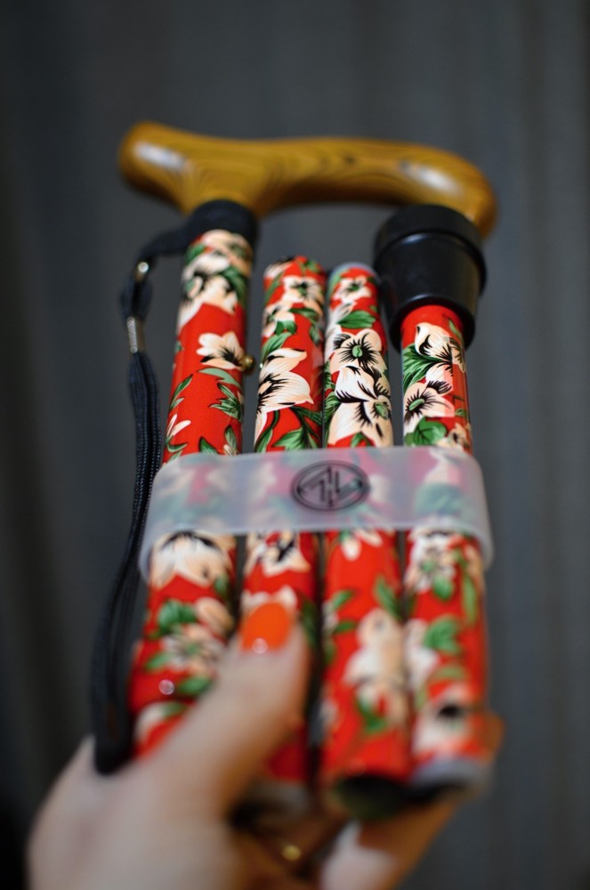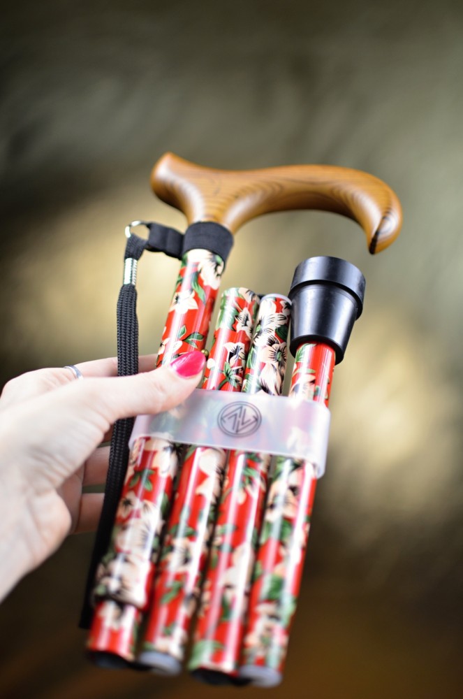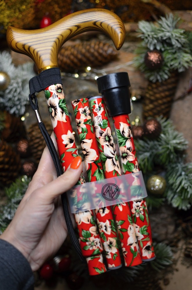 Beautiful folding walking stick in cheerful red colour with Hawaiian pattern. The cane fits in a backpack or handbag. The walking stick has a slightly sturdy but very comfortable wooden handle and an increased weight capacity of up to 110 kg. A black fabric wrist strap is included.