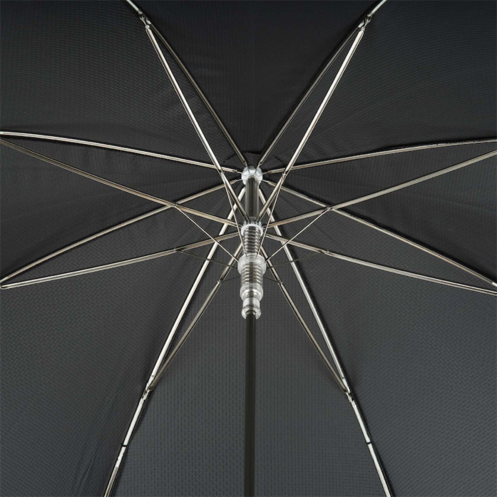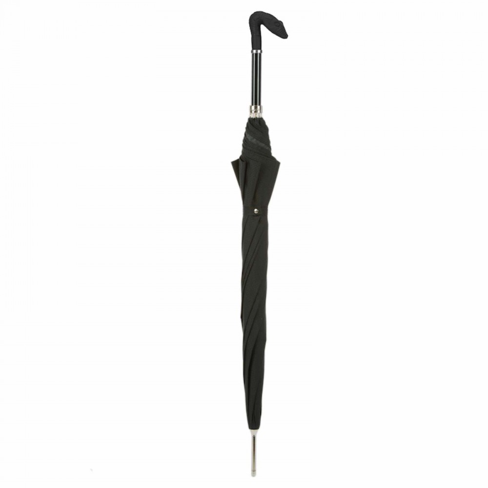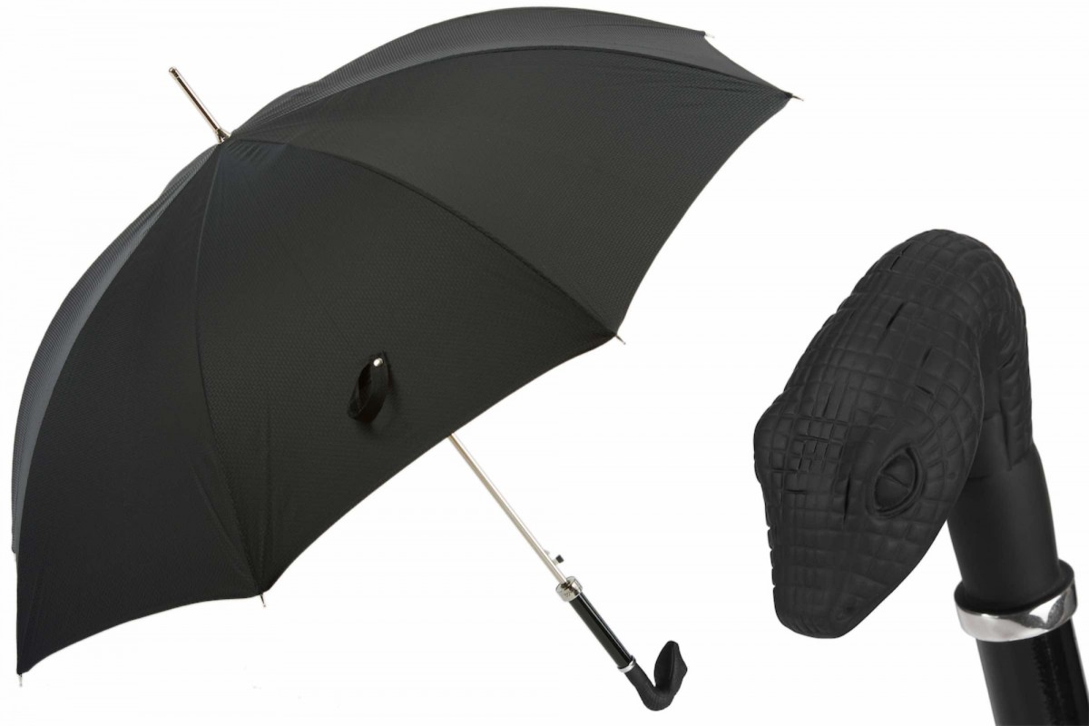 Dark umbrella with a black canopy, shaped handle and silver details. The upper canopy is also in black with minimalist and effective patterns. The handle depicts a snake head and is in black with a rubberized design.