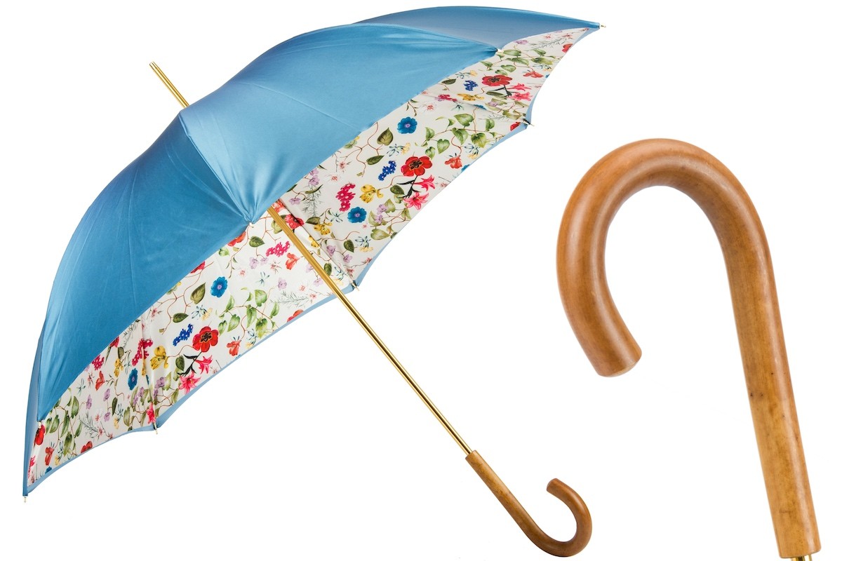 Beautiful romantic umbrella with a pleasant wooden handle and a double shell in sky blue, which hides a colourful print of meadow flowers on the inside.