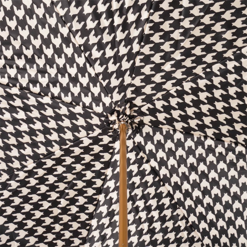 Luxury umbrella with double canopy, art deco handle and gold details. The top canopy is in black and the outer canopy is in beautiful beige and black with a "cocksfoot" motif, also known as "houndstooth". It is an unmistakable pattern that has become a symbol of sophistication and good taste.