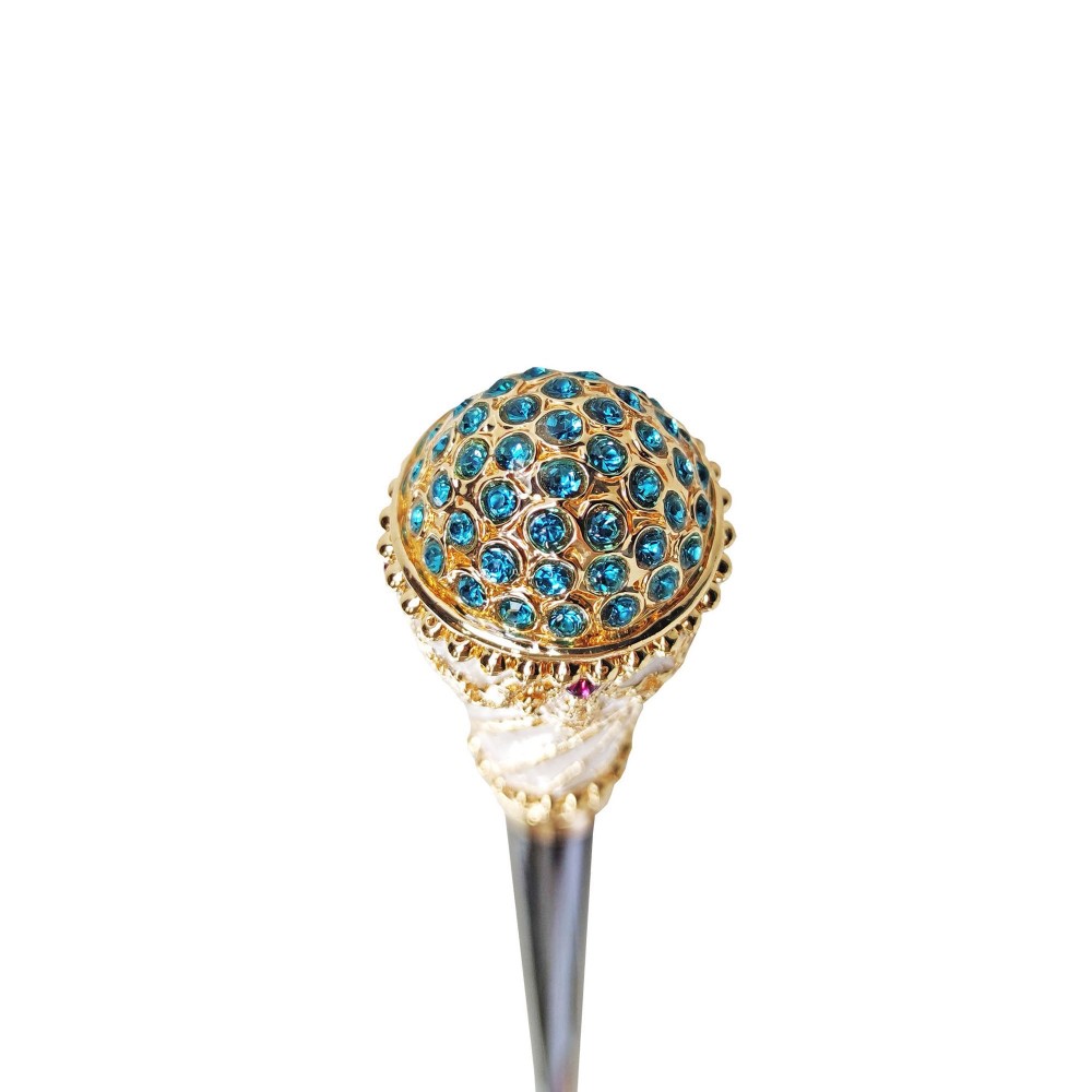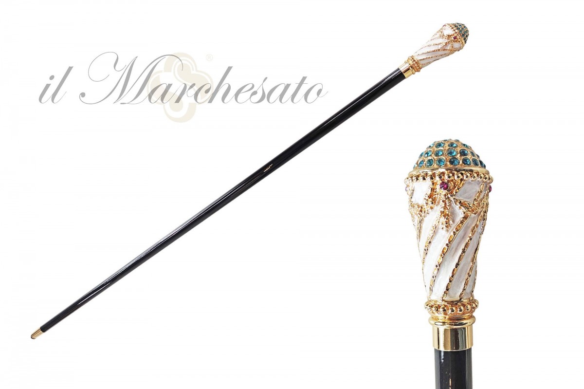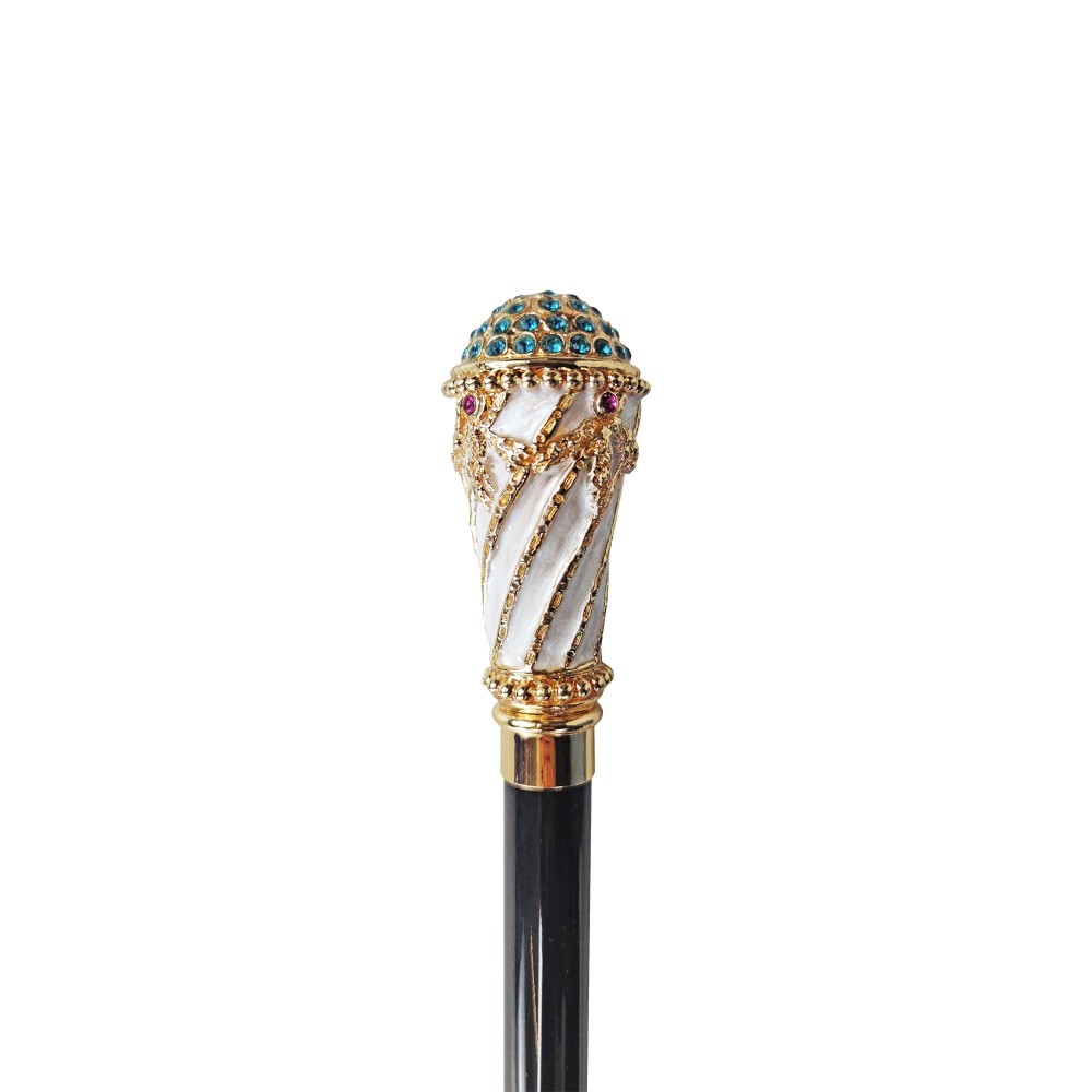 Luxurious walking stick with a shaped handle that is very richly decorated. It is gilded with 24 carat gold, hand-painted with pearlescent paint and set with blue and red crystals from the Swarovski workshop. The body is made of high-quality beech wood and treated with black glossy varnish.