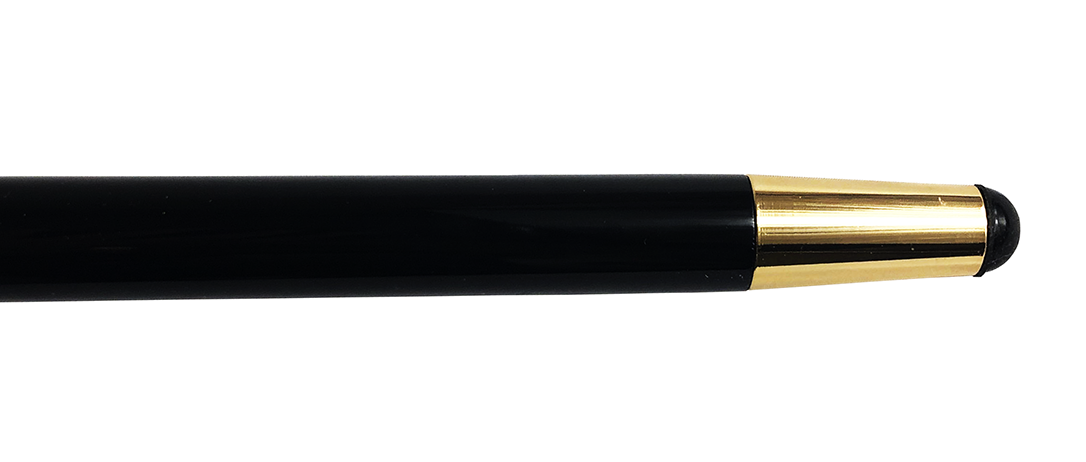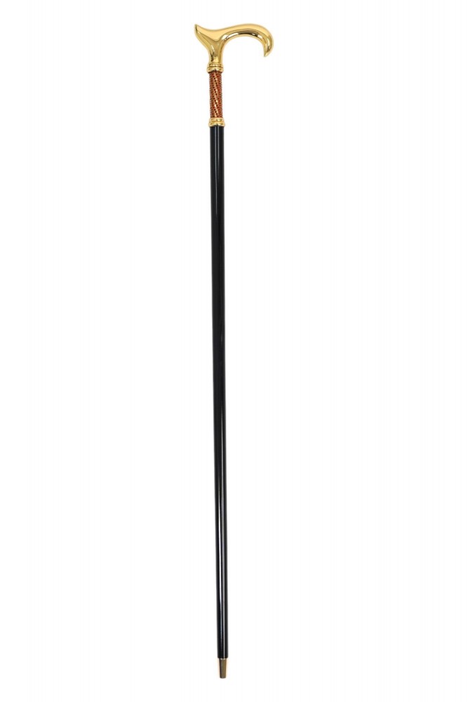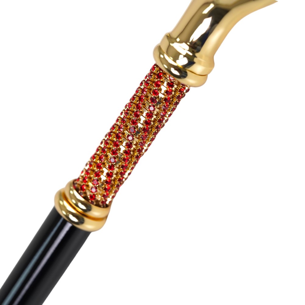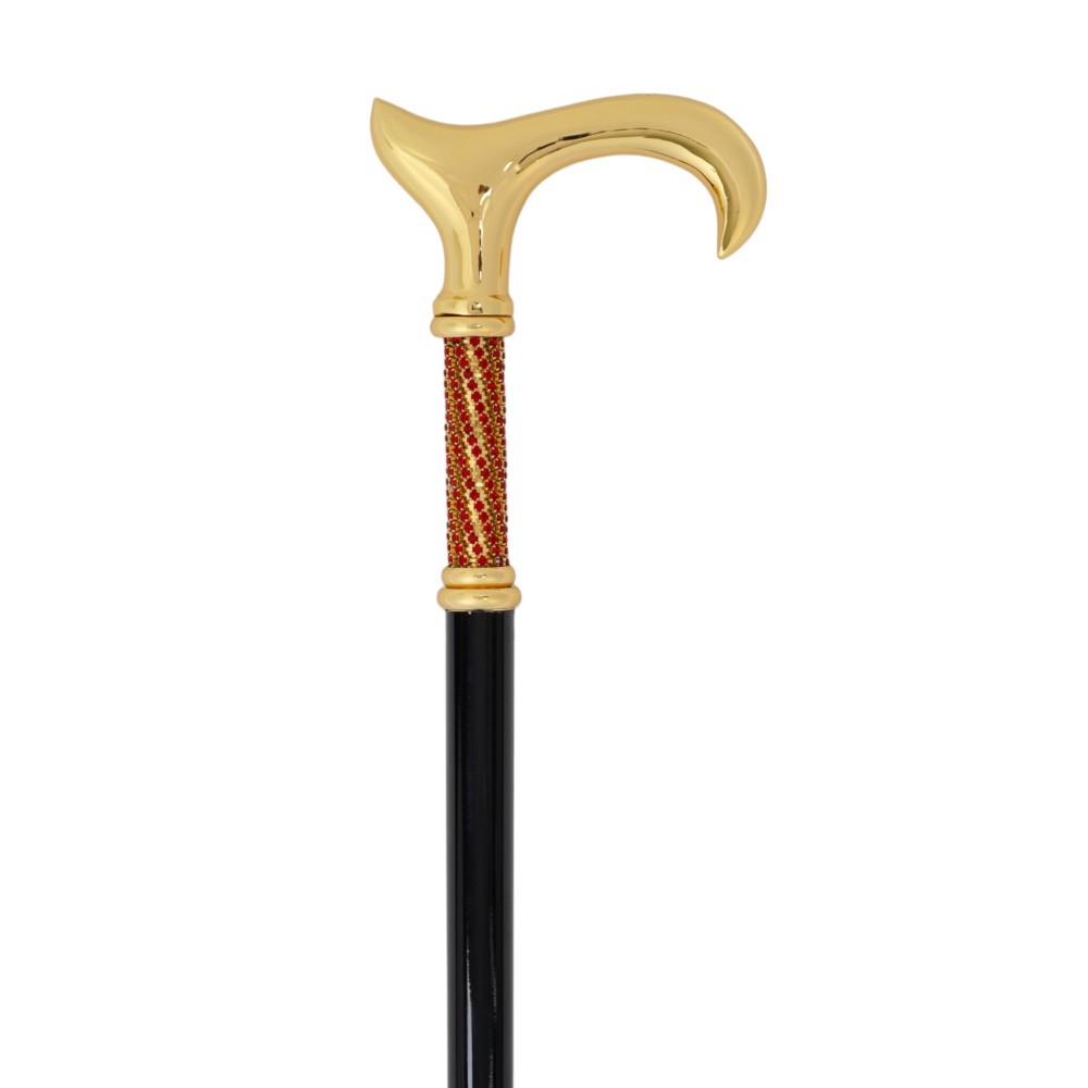 Luxury cane with derby handle and red crystal decoration. The gold elements are 24-carat gold plated, the body of the cane is made of high-quality beech wood and treated with black glossy varnish.