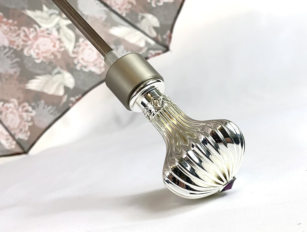 Luxury women's umbrella. Exclusive design of hawks and hibiscus flowers on a wine field, brightens up even a gloomy day. The handle is made of brass, silver-plated with 925 sterling silver and with an amethyst stone on the top. It is a beautiful, fashionable umbrella for ladies.