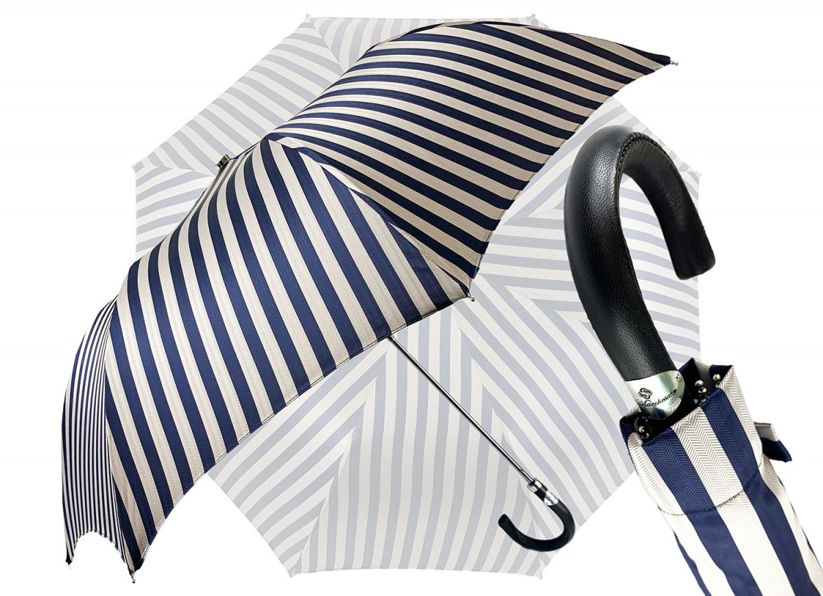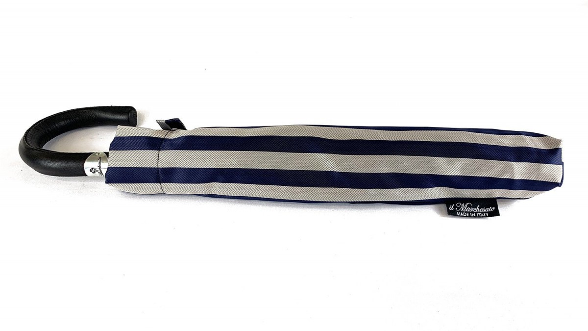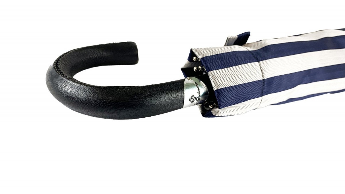 Exkluzivní pánský skládací deštník v elegantní tmavě modré a šedé barvě s proužkovaným vzorem as kulatou rukojetí obšitou černou kůží. Deštník má ocelovou žebra, se zátkou na násadě proti poškození větru.