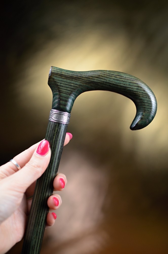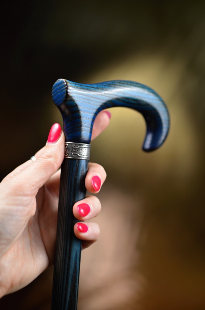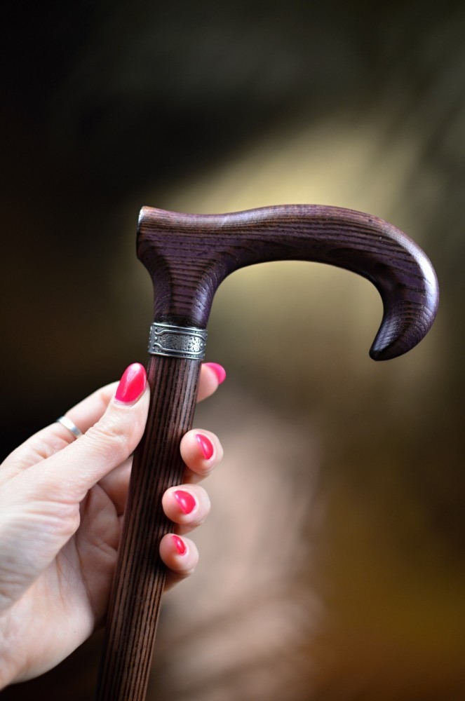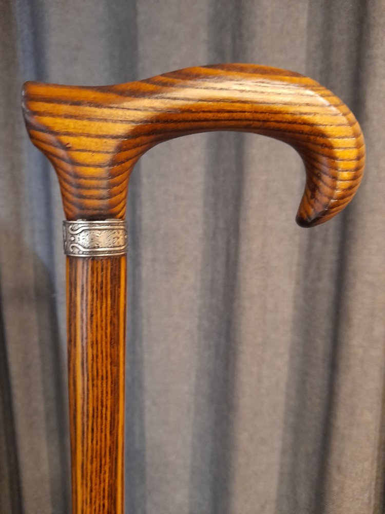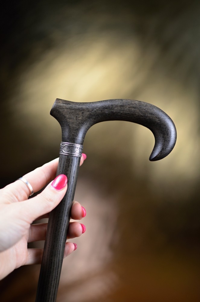 An elegant walking stick made of ash wood with a slightly stylized handle. This stick combines a natural look with a subtle design and is available in four attractive color options. There is a delicate, silver ring under the handle.