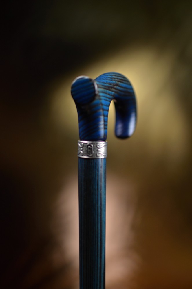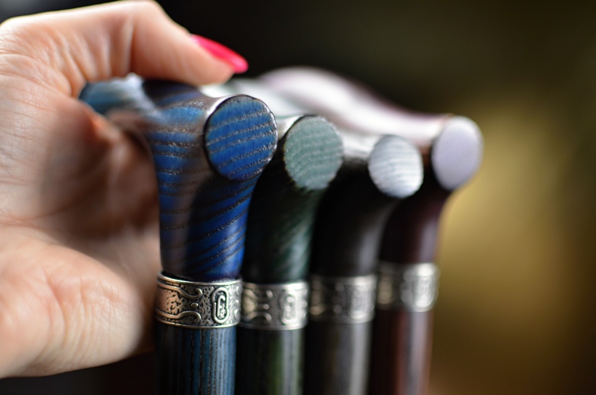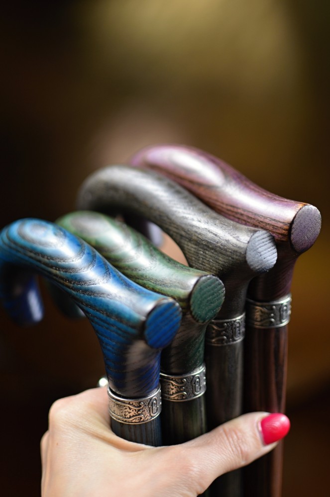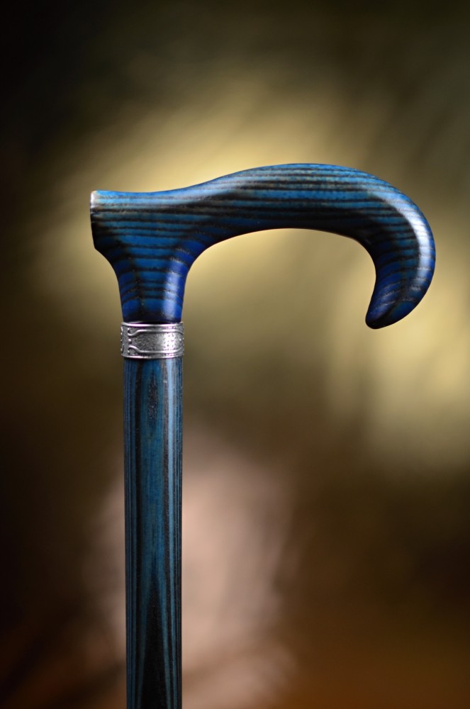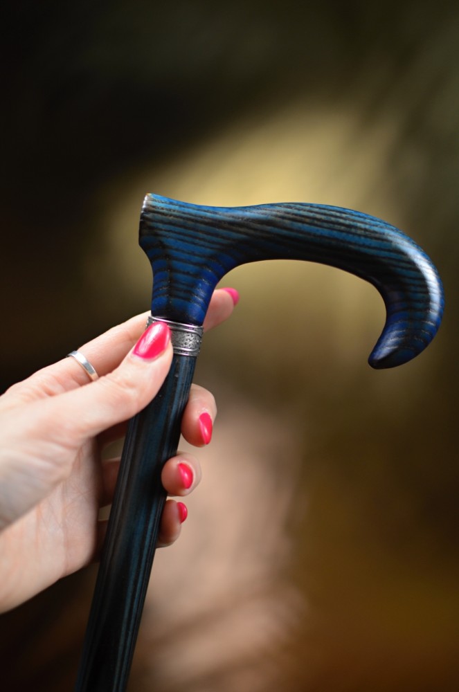 An elegant walking stick made of ash wood with a slightly stylized handle. This stick combines a natural look with a subtle design and is available in four attractive color options. There is a delicate, silver ring under the handle.