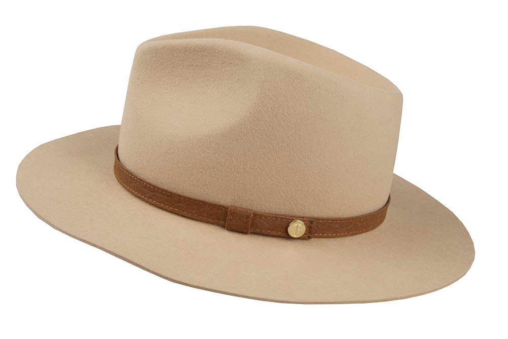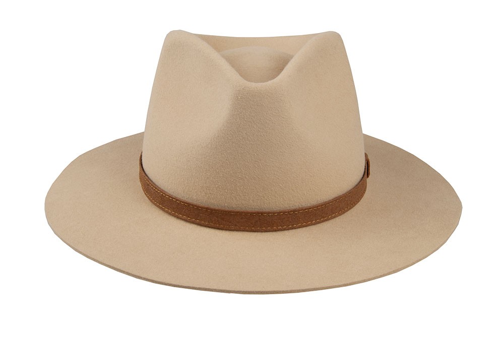 Luxurious felt hat in beige with a discreet strap made of ecological Piňatex (from pineapple leaf waste). Of course, there is a high-quality and comfortable sweatband. The hat has a wider brim and holds its shape nicely.