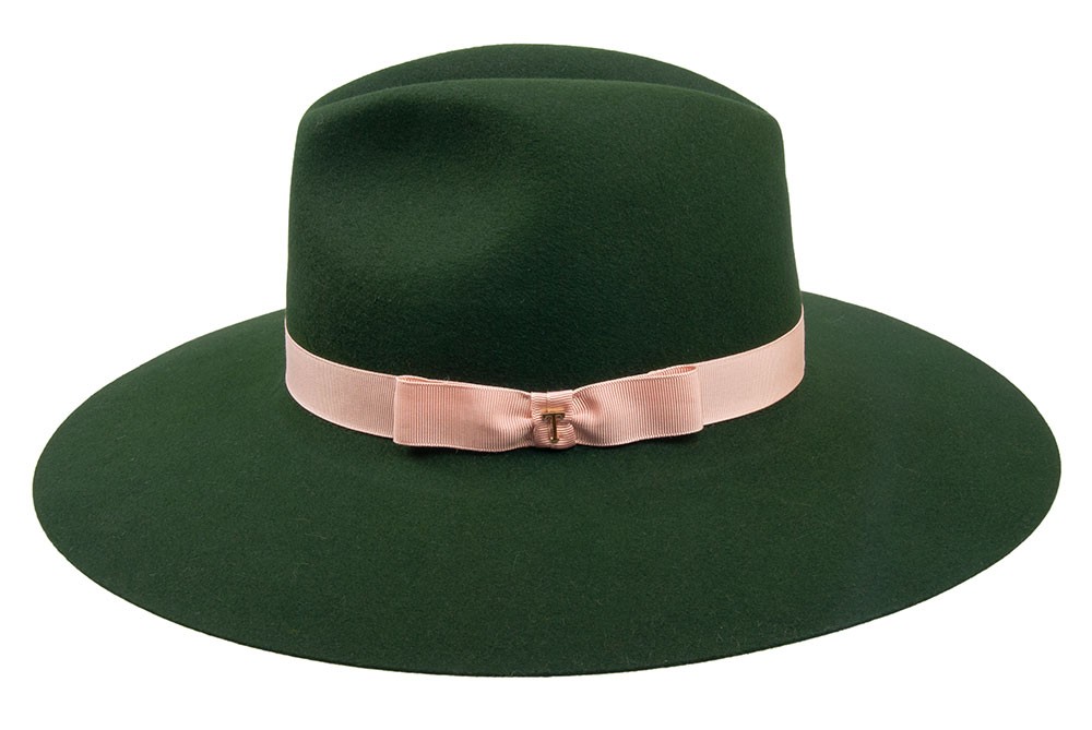 Elegant female hat in beautiful emerald colour, decorated with light pink ribbon. This hat has wide brim and definitely will be your dominant accessory. Top quality made by Czech brand TONAK.